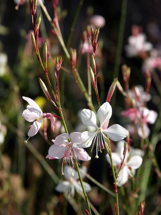 Évelő díszgyertya. Gaura /Oenothera lindheimeri. 50-100 cm magasra növő, erőteljes növekedésű, felálló szárú, laza habitusú, bokrosodó évelő. Fürtökben nyíló, kecses virágai fehéren lengedeznek. Az egyik kedvenc évelőm, kitűnően kombinálható zsályákkal és díszfüvekkel egyaránt, és persze megannyi más növénnyel.
